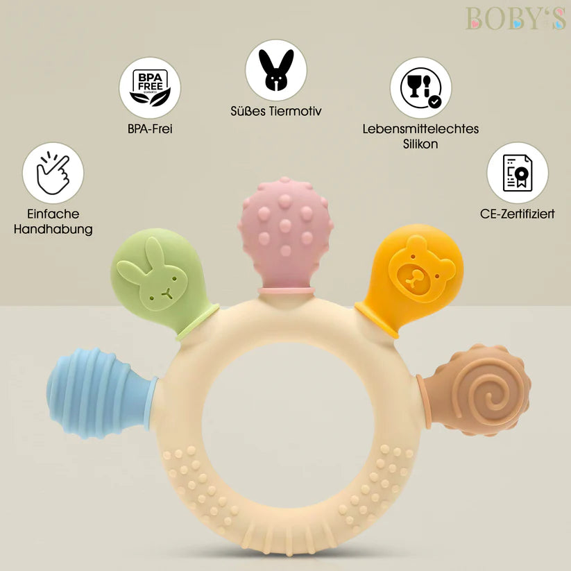 Verschiedene Texturen zur Zahnfleischmassage – Weiche Noppen, Rillen und Strukturen stimulieren sanft das Zahnfleisch und fördern die Durchblutung. Die unterschiedlichen Oberflächen bieten sensorische Abwechslung und helfen, den Zahnungsschmerz natürlich zu lindern.