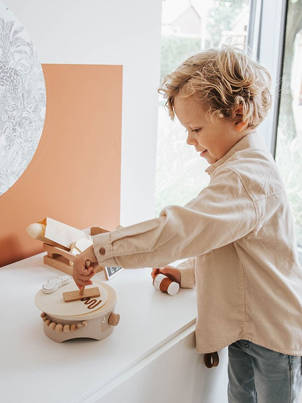 Mit diesem lustigen Crêpe-Maker aus Holz von Label Label kann Ihr Kind die leckersten Pfannkuchen zubereiten.