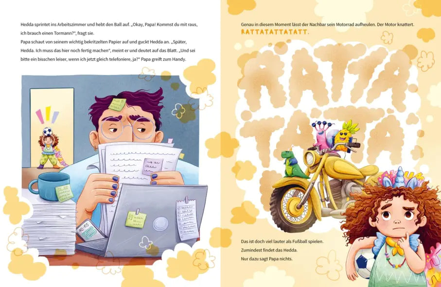 Hedda findet es richtig blöd, dass Papa sie immerzu um Ruhe bittet, und sie wird davon sehr wütend. Und extralaut. Die ganze Wut über die Ungerechtigkeit und Papas Beschäftigsein bricht sich Bahn. Hedda stampft und brüllt und weint viel lauter als die Waschmaschine, die Hunde oder das Motorrad.
