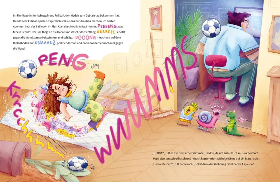 Hedda findet das sehr seltsam, denn über die bellenden Nachbarshunde, das knatternde Motorrad vor dem Fenster oder die wummernde Waschmaschine in der Küche beschwert Papa sich nie. Dabei machen die wirklich Krach. Sie hingegen spielt doch nur! Fußball im Flur, zum Beispiel. Klar, dass das auch mal wummst. Auch klar, dass sie beim Erschreckenspielen ganz laut „Buh“ rufen muss, dass sie in Omas Trompete nicht leise pusten kann und dass Skitty, ihr Besenstiel-Wildpferd, nun mal mit dem Hufen klappert.