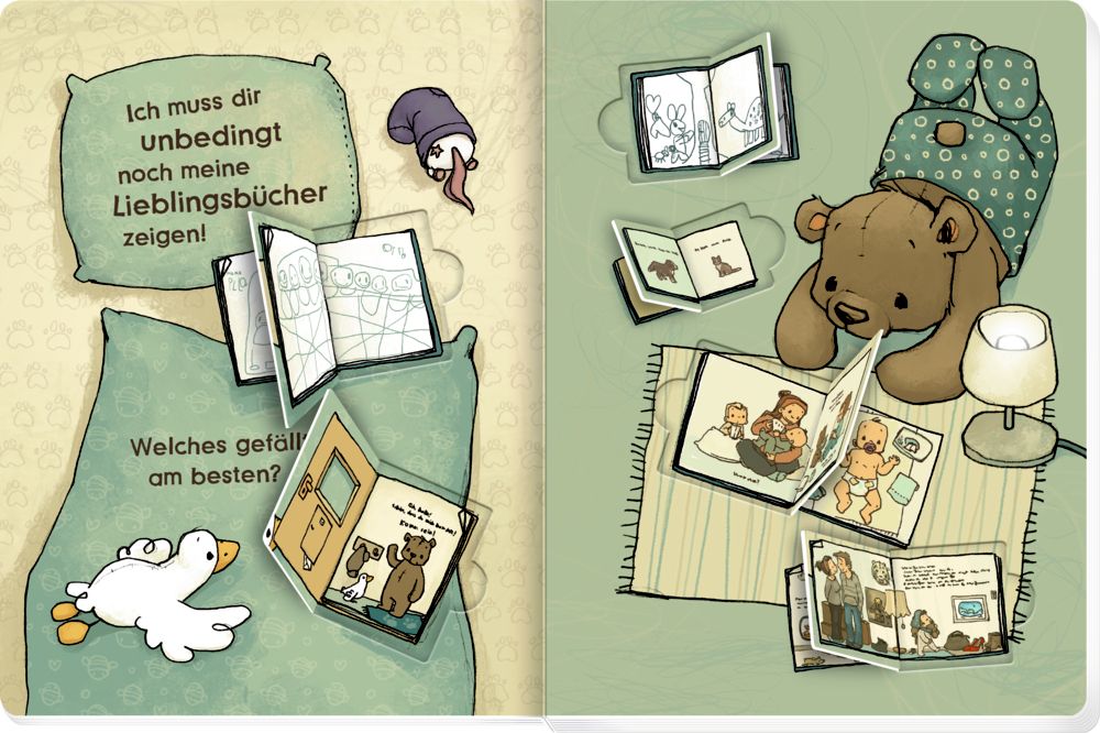 Dieses hochwertig ausgestattete Mitmachbuch lädt Kinder ab 18 Monaten dazu ein, den kleinen Bären beim Zubettgehen zu begleiten. Charmant erzählt und liebevoll illustriert von Joëlle Tourlonias, wird das Einschlafritual zu einem besonderen Erlebnis. Mit vielen Mitmach-Elementen, einfühlsamen Reimen und detailreichen Bildern wecken Klappen und Schieber die Neugier, fördern spielerisch die Feinmotorik – und schaffen eine vertraute, geborgene Abendroutine für Eltern und Kinder.