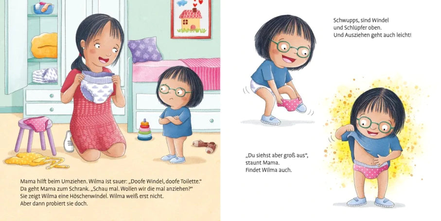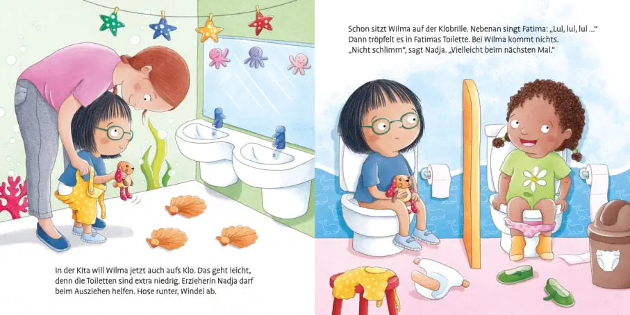 Wilmas großer Bruder Louis war gerade auf der Toilette. Spannend! Jetzt will Wilma es auch versuchen. Erst probiert sie es in der Kita. Auf extra niedrigen Klos. Aber es kommt noch nichts. Und zu Hause? Da ist der Sitz viel zu hoch! Doch Papa und Mama haben gute Ideen, wie sie Wilma helfen können. Welche das wohl sind?