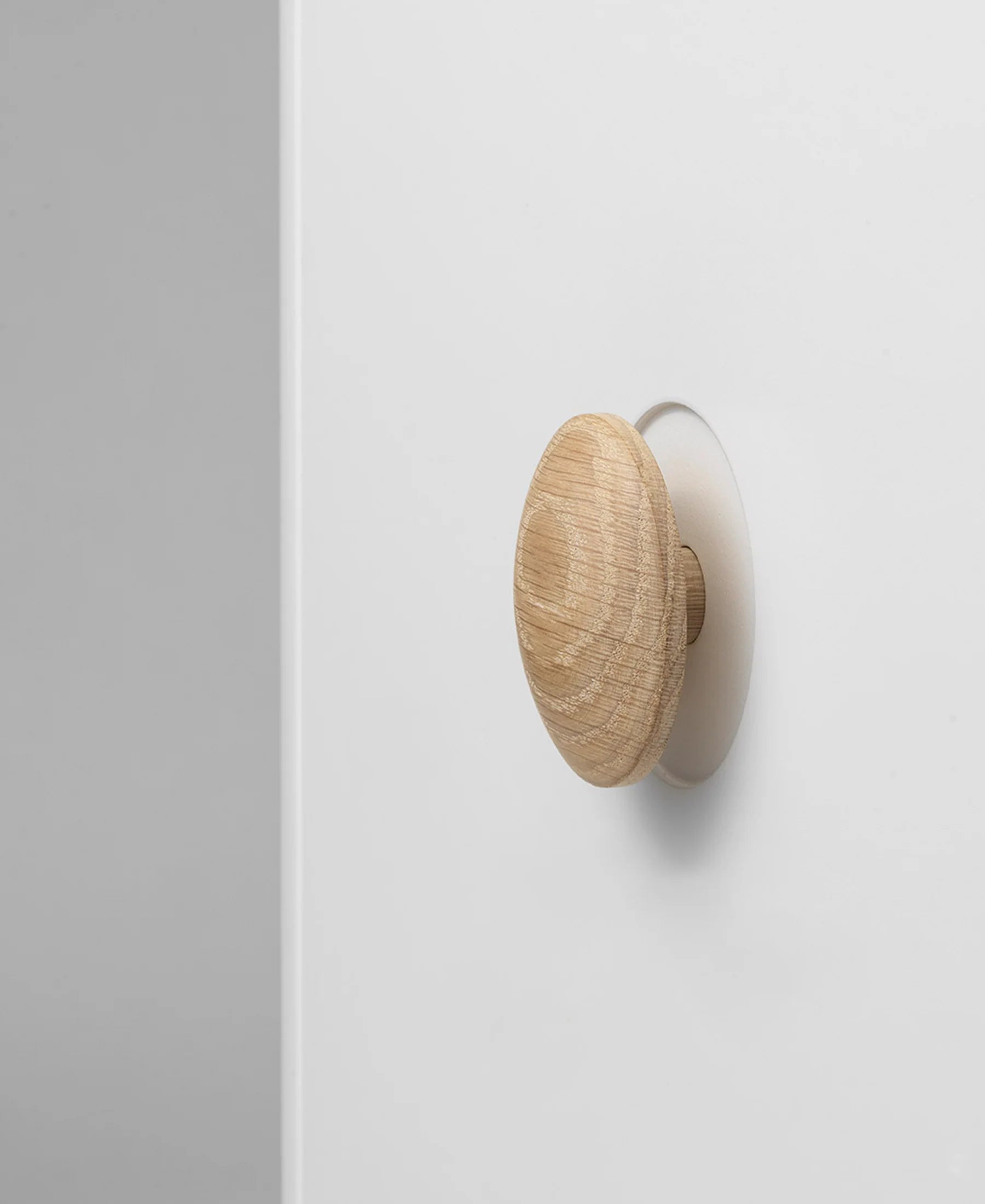 Die Schubladen sind mit handgefertigten Griffen aus Kernleder versehen. An beiden Seiten der Kommode befindet sich zudem ein ausziehbarer Haken. Diese eignen sich ideal für das Alltagsoutfit oder dekorative Elemente – und sind auch für sich genommen ein schönes Detail.