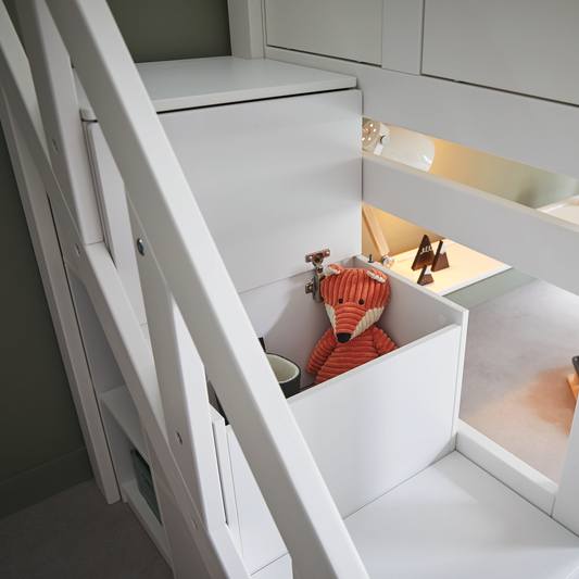 Das Mittelhochbett mit seitlicher Treppe kombiniert leichten und sicheren Aufstieg mit cleverem Stauraum und bietet einen schönen Spielbereich unter dem Bett an. Man kann den Bereich unter dem Bett mit einem Spielforhang, Spielmatratzen, Regalen und Accessoires in einen vielfältigen Bereich verwandeln. In den drei Treppenstufen befinden sich drei geräumige Aufbewahrungsbereiche. Die Stufen öffnen sich nach oben und sind mit Soft-close Technologie versehen. Die Sicherheitsöffnung an der Front der Stufen hilft dabei das Klemmen von Fingern zu vermeiden. Das Treppenmodul verfügt ebenfalls über ein seitliches Bücherregal.