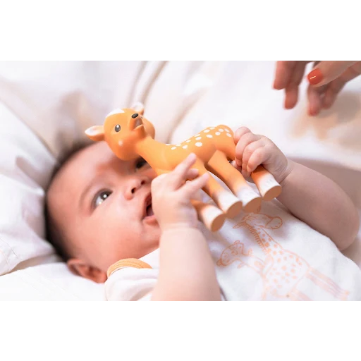 Lernen Sie den entzückenden FanFan kennen, das neueste Mitglied der geliebten Sophie la Girafe Familie! Das kleine Rehkitz ist der beste Freund von Sophie. FanFan wird mit Sorgfalt aus 100 % Naturkautschuk aus dem Hevea-Baum hergestellt. Sein spielerisches Design mit den hellen Punkten regt die Aufmerksamkeit Ihres Babys an und fördert die Entwicklung seines Sehsinns.