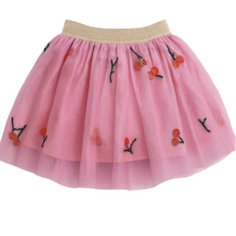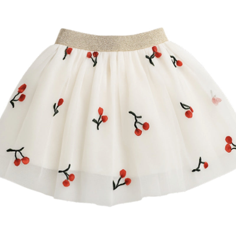 Ein wunderschöner Tüllrock, verziert mit kleinen, verspielten Kirschen, die bei jedem Schritt sanft mitschwingen. Perfekt für Geburtstagsfeiern und den Alltag. Der Rock hat einen elastischen Bund und schwingt schön – ideal zum Drehen und Tanzen. Einheitsgröße.