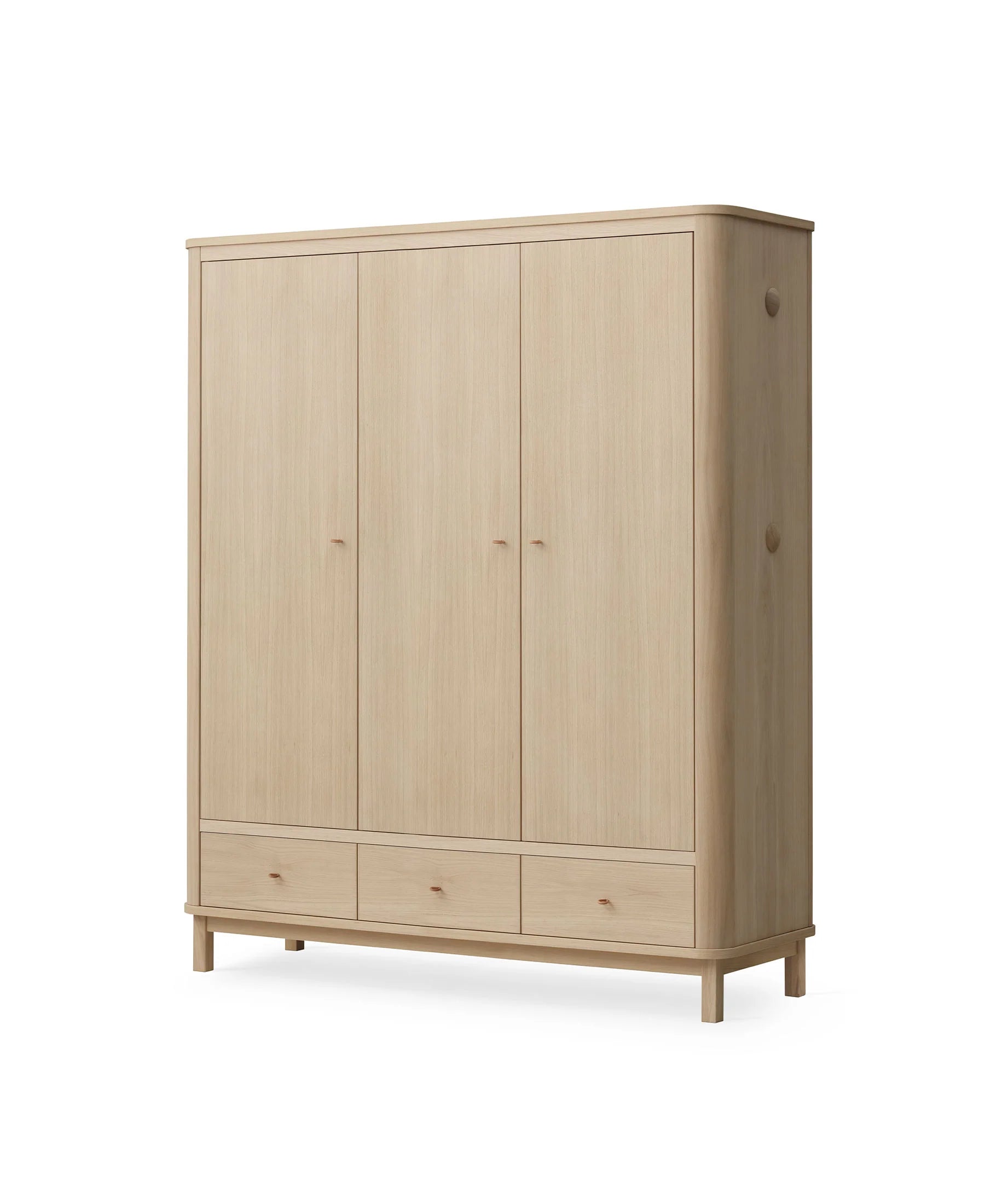 Der Wood Kleiderschrank 3-türig besteht aus MDF in Eiche furniert mit Beinen und Haken aus weiß geölter massiver Eiche. Das Innere des Kleiderschranks ist aus weiß lackiertem MDF.